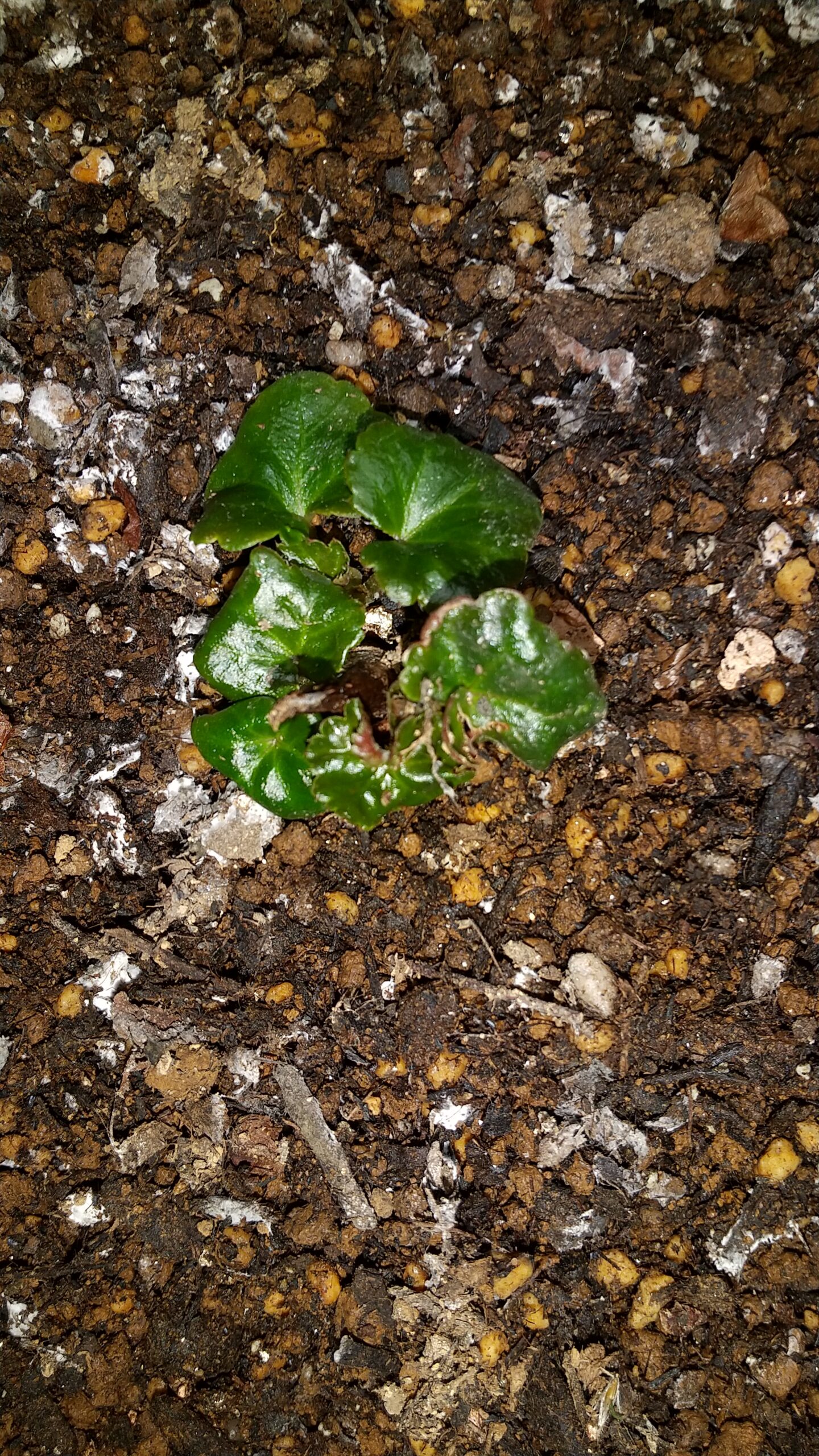 下の写真は、数日前に植え替えられたプラントなのですが、元の3つの幹は残念なことに15センチほど伸びたところで徐々に枯れてしまいました。しかしながら、枯れた幹の脇からこれらの葉が生えてきたのです。そして、新たに植え替えました。