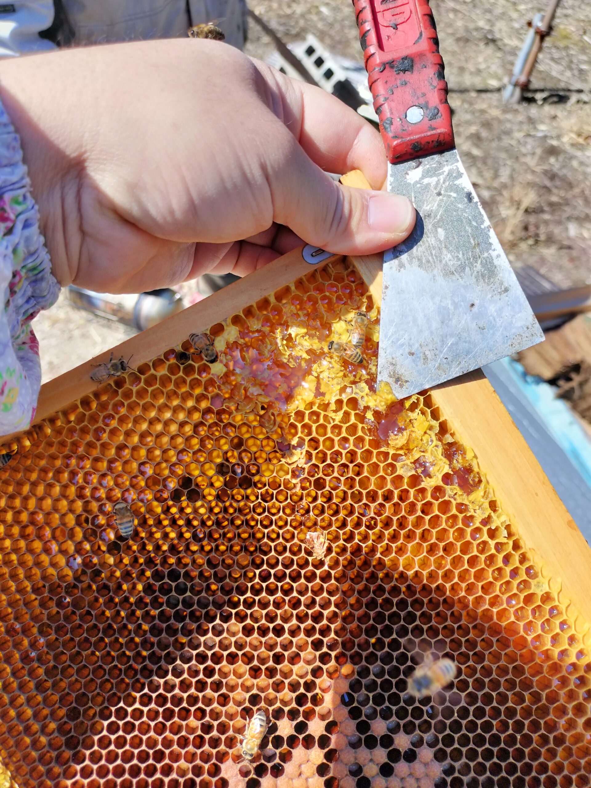 これらは人間が蓋を傷つけてやらないとミツバチたちが食べようとしないのでこのようにへらで巣に傷をつけます。