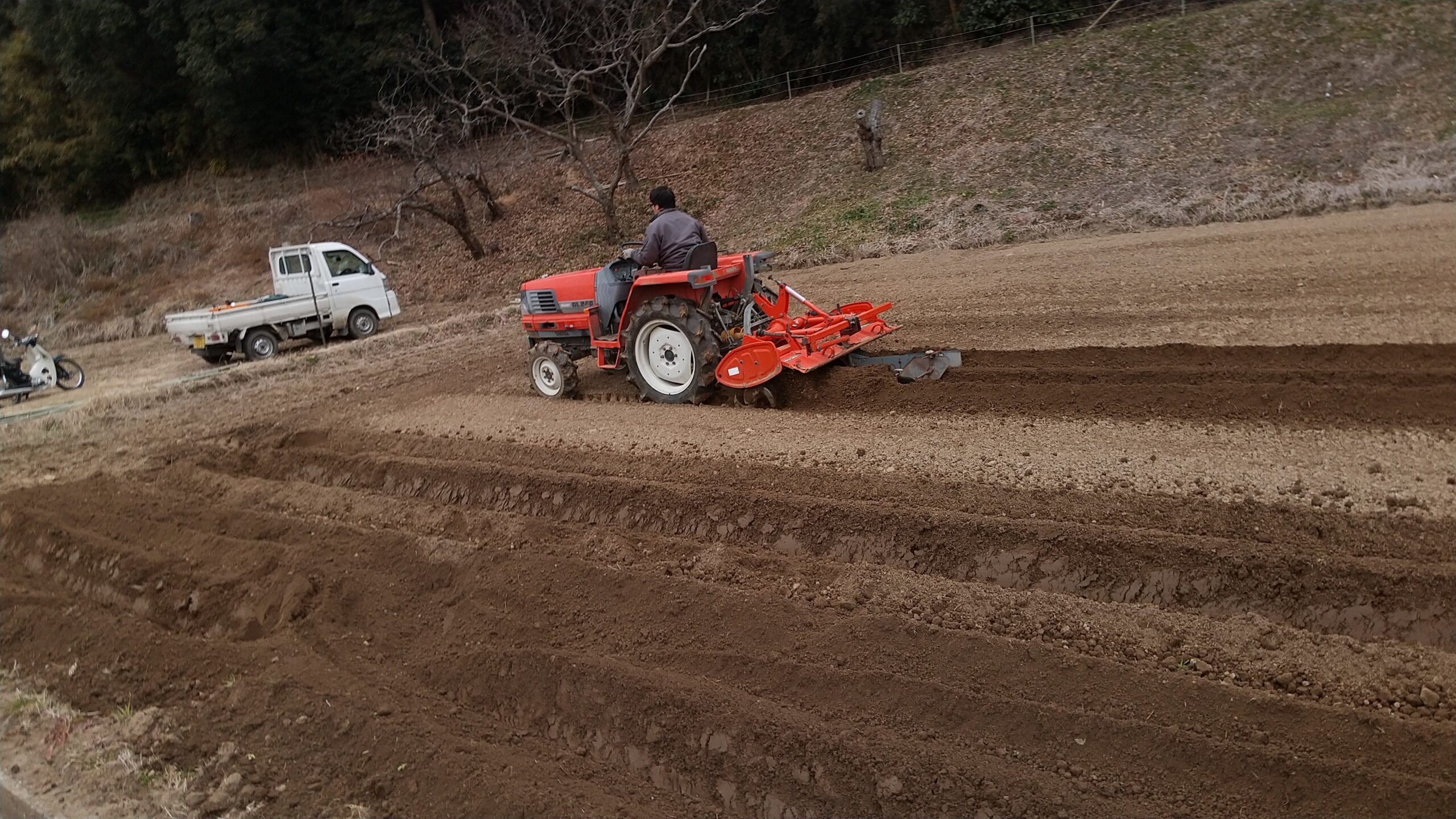 写真は養蜂場から300メートルくらいにある、1アールほどの畑です。そこに耕運機で畝を入れているのは雄紀です。