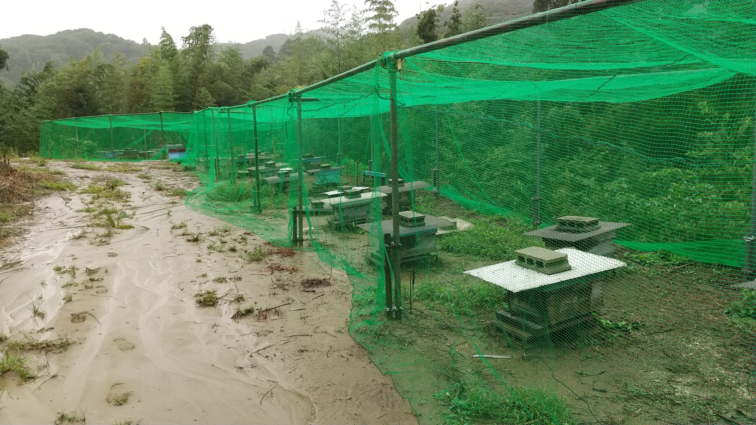 スズメバチ対策のネット張りを終えた養蜂場です。