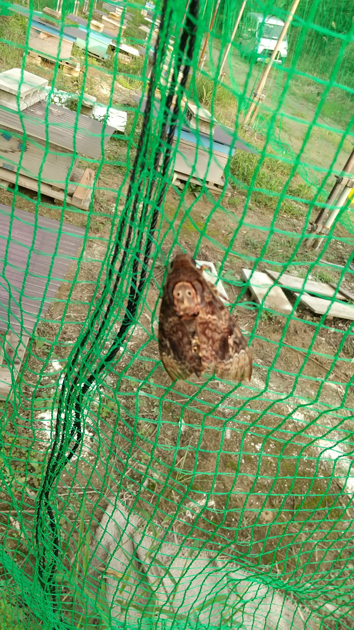 おそらく、メンガタスズメが狙うのは、自然の中にある日本ミツバチの巣なのでしょう。このメンガタスズメ、私たちがスズメバチ駆除をしている1時間ほど、ネットに張り付いてじっとしていましたが、翌日、養蜂場に行ってみるとそこにはいませんでした。