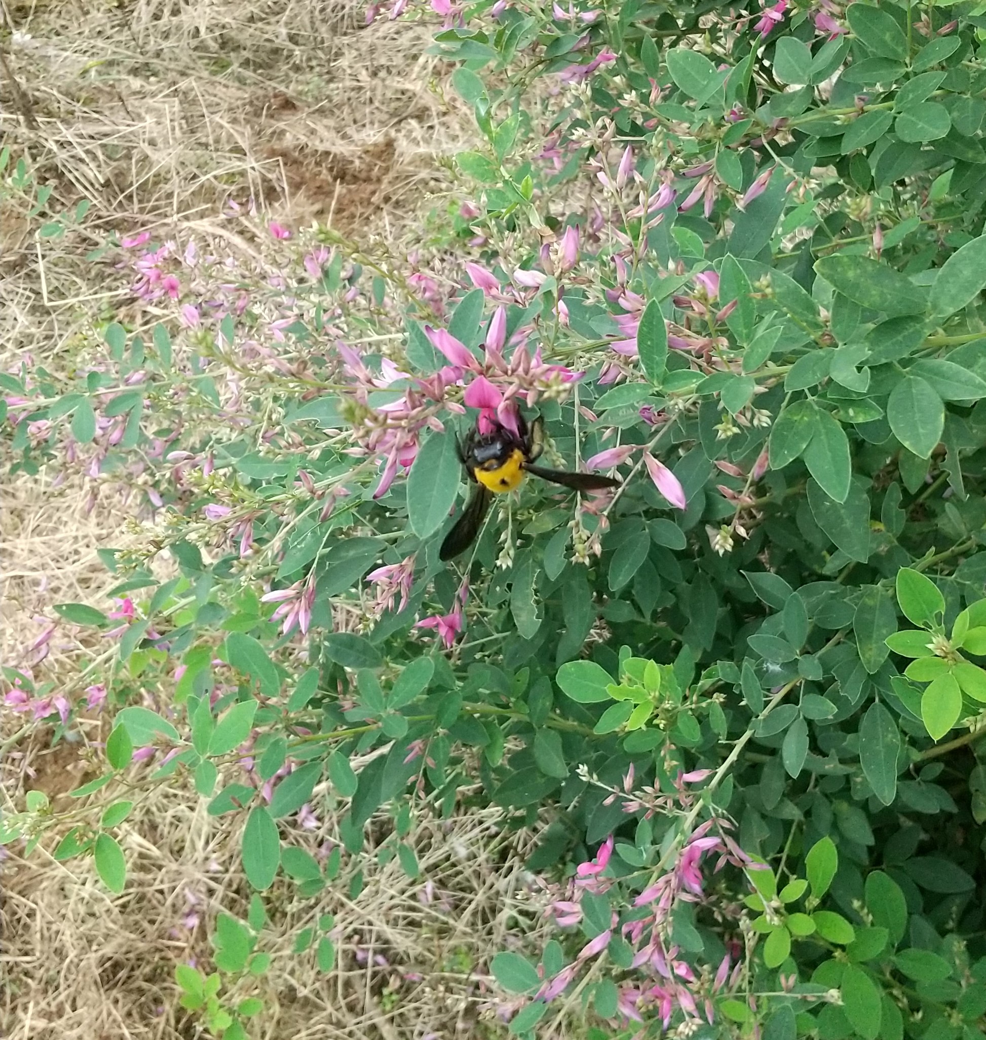 写真は養蜂場のハギの花の蜜を集めるクマバチです。雄紀、隆一によると蜜源植物として期待して植えたハギですが、その蜜を盛んに集蜜するのはクマバチたちでした。彼らはミツバチの4倍くらいの体躯があり、羽音も重厚なのですが、動作はミツバチ、スズメバチと違って緩慢で、スズメバチのような肉食ではありません。ミツバチと共存している彼らは、私たちにとって戦闘的なスズメバチ群とは違い、くまのプーさん的、親しみ深い養蜂場の仲間です。
